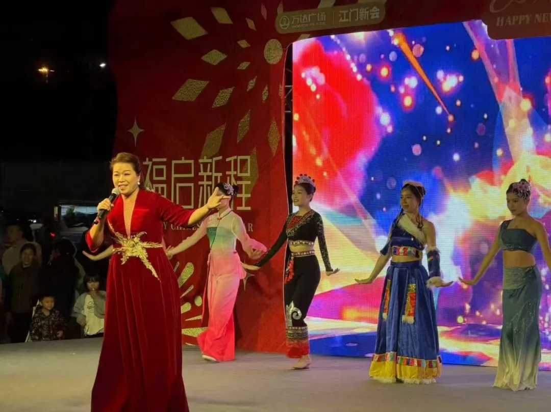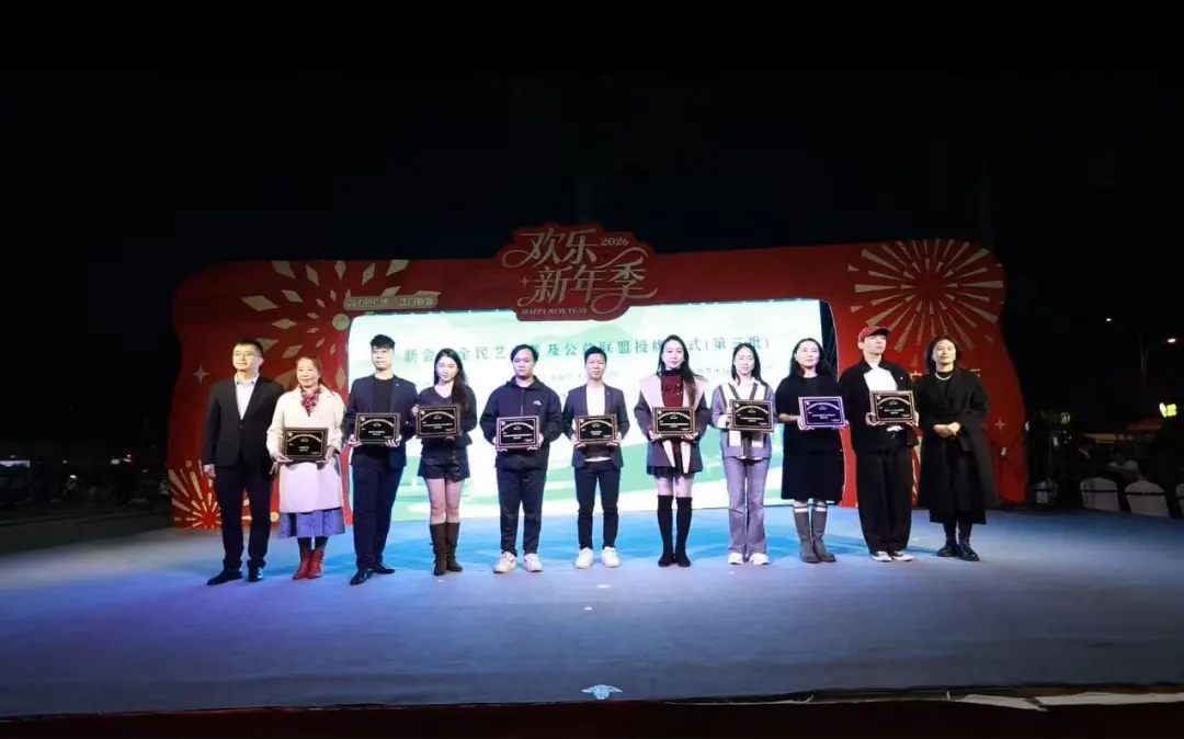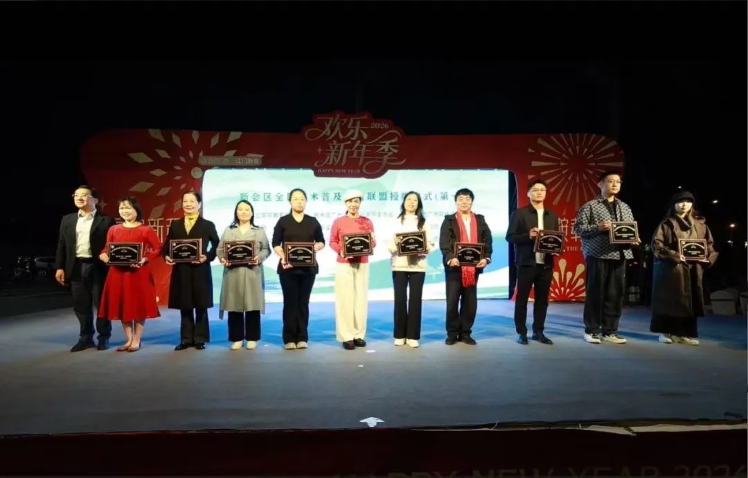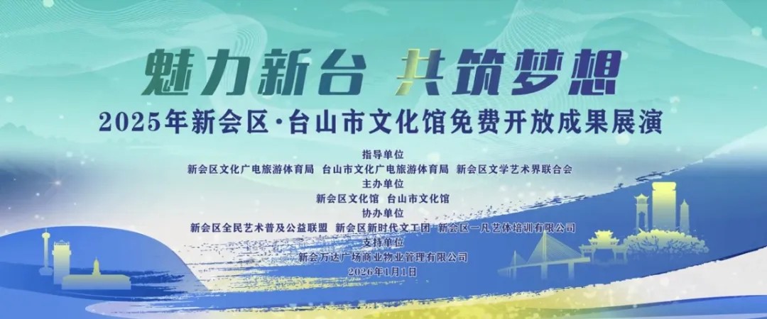 辞旧迎新之际,为推动全民艺术普及工作走深走实,加强新会与台山两地文化交流合作,2026年1月1日晚19:30,新会区全民艺术普及公益联盟授牌仪式与2025年新会区·台山市文化馆免费开放成果展演在江门新会万达广场1号门外广场舞台精彩启幕。活动由新会区文化广电旅游体育局、台山市文化广电旅游体育局、新会区文学艺术界联合会指导,新会区文化馆、台山市文化馆主办,新会区全民艺术普及公益联盟、新会区新时代文工团、新会区一凡艺体培训有限公司协办。