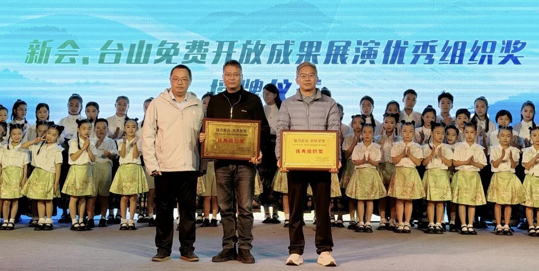展演尾声,新会区文学艺术界联合会主席陈明亮为新会文化馆、台山市文化馆颁发“新会、台山免费开放成果展演优秀组织奖”,表彰两地文化馆在免费开放工作与文化交流中的突出贡献。
