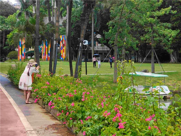 下沙公园的游乐设施丰富,许多家庭在此度过欢乐时光。郭永乐 摄(资料图) 走进江海区下沙公园,秋天的阳光,透过老榕树枝头,洒在草坪上,孩子们欢快的笑声,穿过碧波水面,风铃一般清脆,游人三三两两结伴而行,或嬉笑打闹,或悠闲漫步……谁能想到,这里曾是俗称水上人家的内河渔民聚居区,也是一个较大的安全隐患点。2019年起,江门以碧道建设为契机,对整个下沙片区进行搬迁改造,打造成一个集运动、文化和休闲为一体的滨河公园。公园建成慢行系统,实现“四道”不间断、无障碍贯通,打造分级亲水平台、榕荫广场、咸水歌广场、观浪桥、文化展示活动中心、儿童乐园等景色,促进人与自然交融、文化与生态互动。同时,注重保留原有的疍家文化等历史文化印记,想方设法保留原有细叶榕、龙眼、蒲葵等大树老树、特色树木共13种、209棵,建成“古墙榕影”等特色景观,成了公园的独特印记和网红点。2022年国庆节,下沙公园布置时花造型,营造以红旗飘扬、花团锦簇、满园尽是“中国红”的节日气氛,表达对党、对祖国的热爱和祝福。