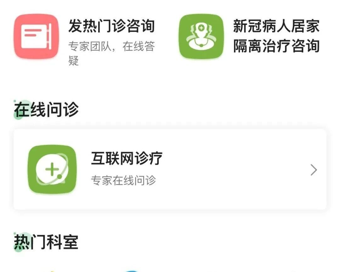 新会人民医院的互联网医院已开通了内科、妇科、儿科、感染性疾病科、肿瘤科、中医科等多个科室医疗服务。为满足疫情期间发热及新冠患者居家隔离诊疗指导需求,同时开设了线上发热门诊咨询及新冠病人居家隔离治疗咨询通道,市民可根据自身需求登录小程序进行专科咨询。