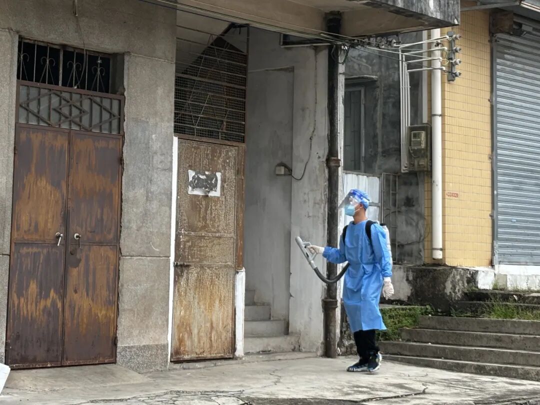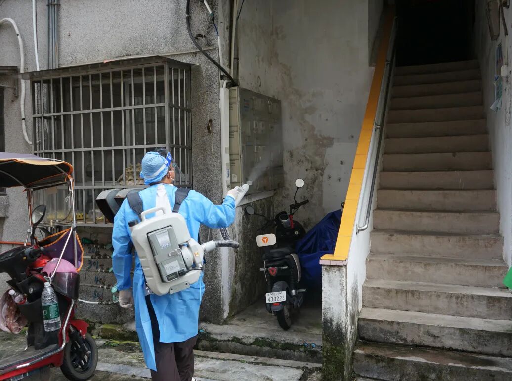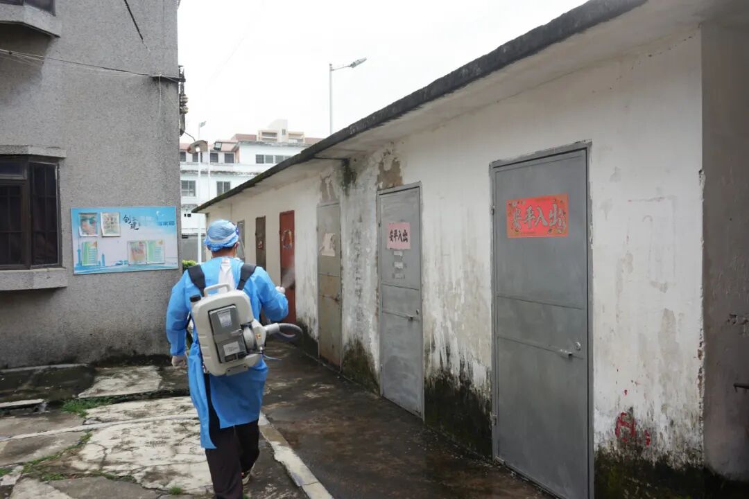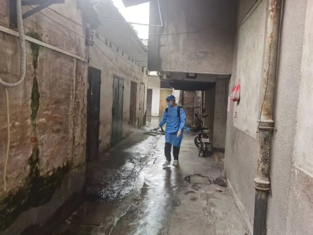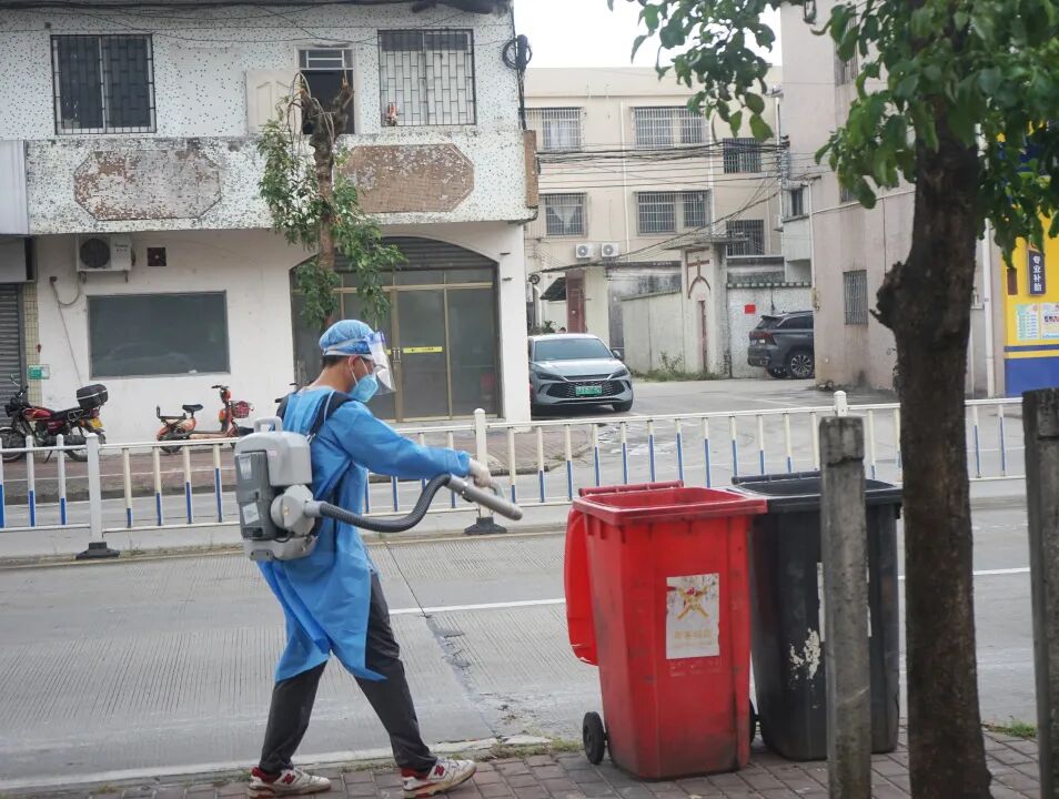 镇疫情防控指挥部组织消杀队伍分片作业,重点对圩镇范围的骑楼底部、住宅楼梯间、单车房及排水口等潮湿区域进行药物喷洒。