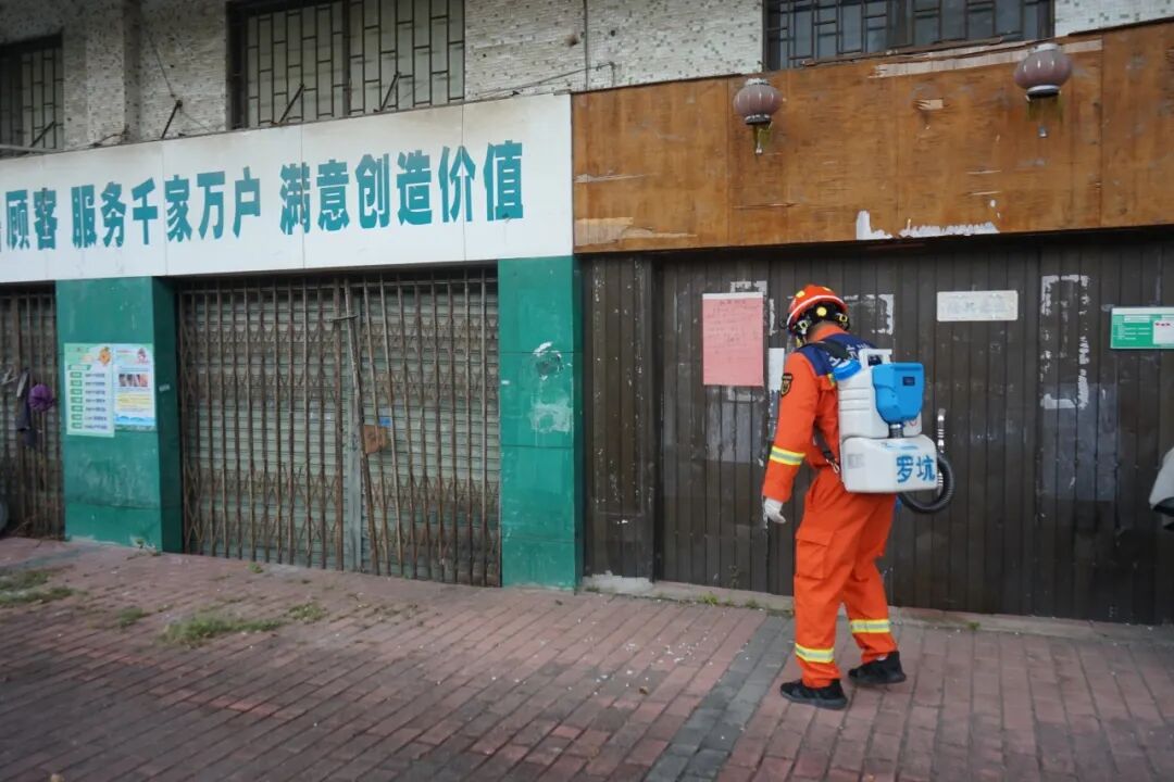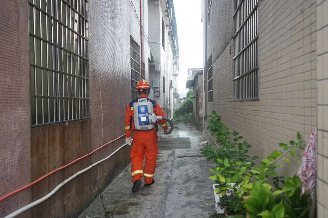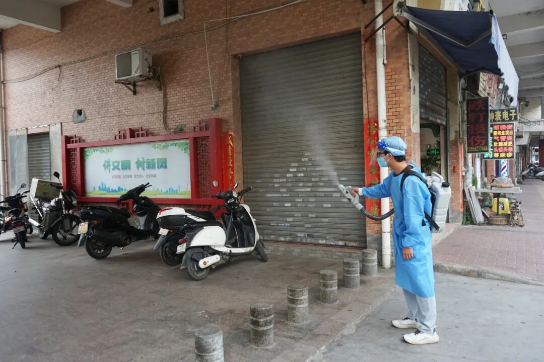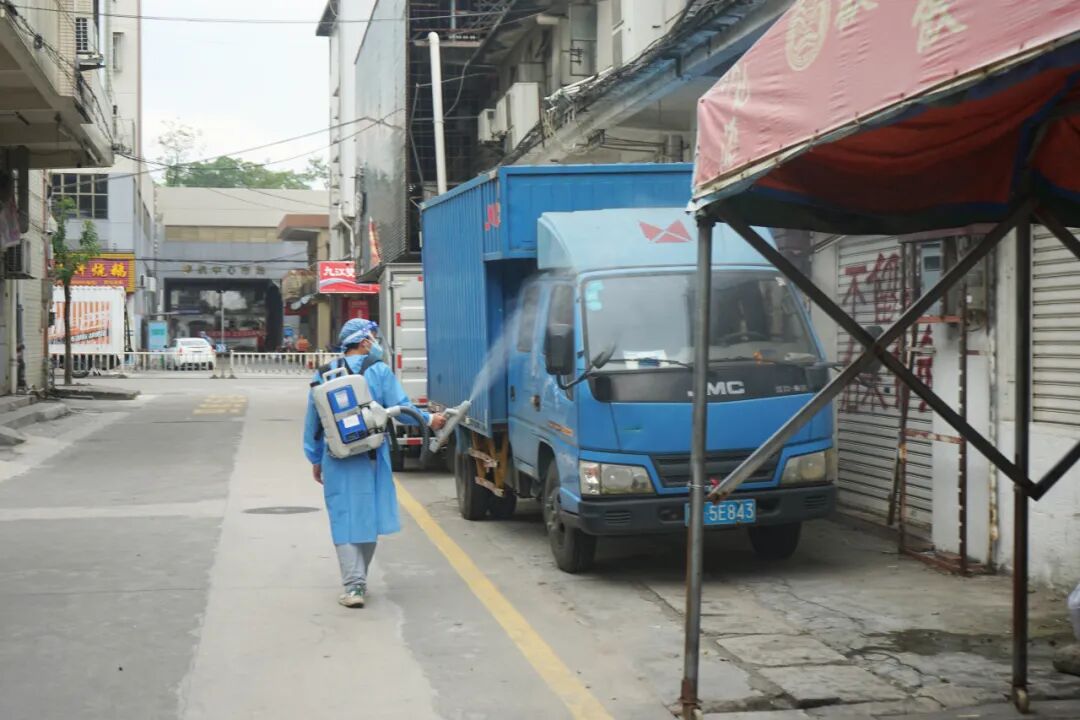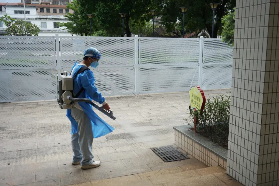 镇疫情防控指挥部组织消杀队伍分片作业,重点对圩镇范围的骑楼底部、住宅楼梯间、单车房及排水口等潮湿区域进行药物喷洒。