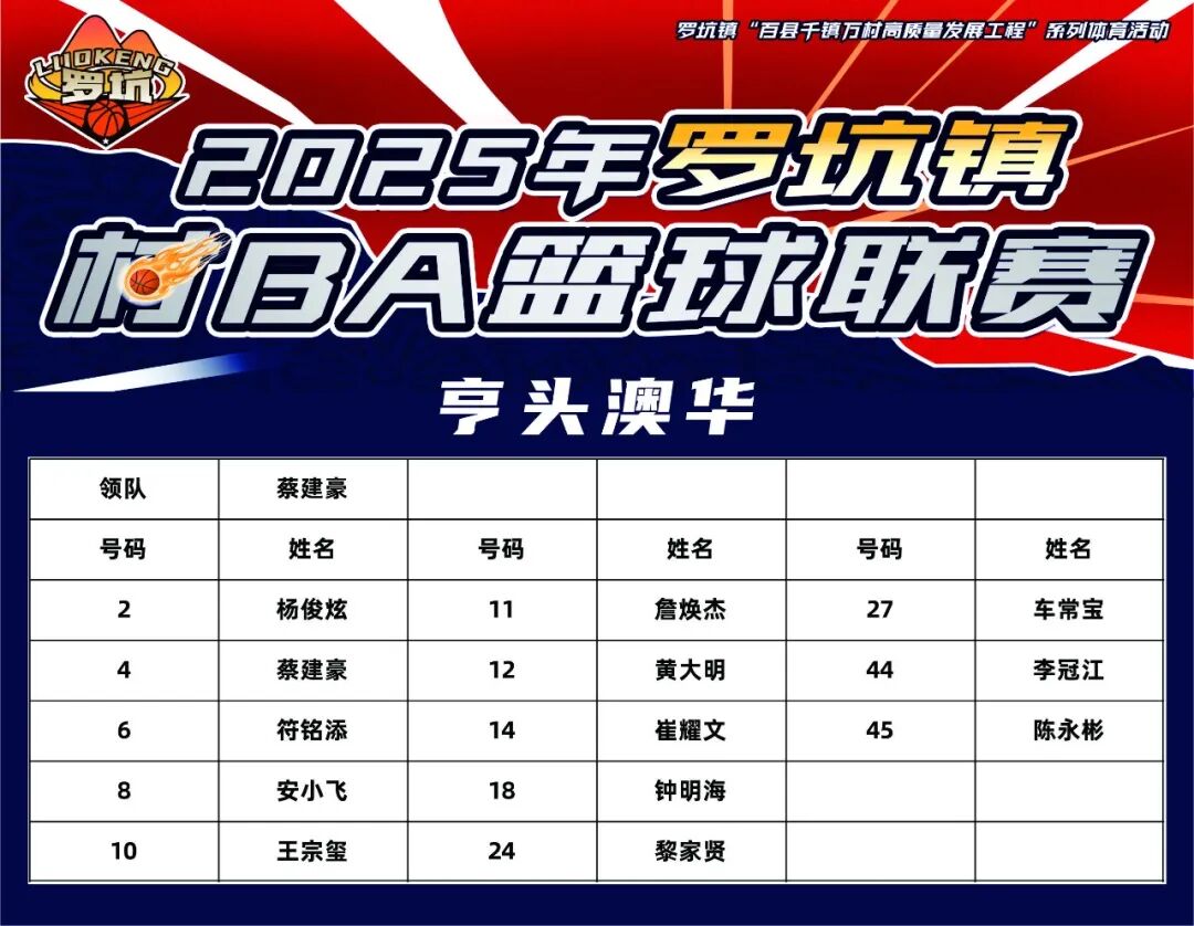 为了充分彰显罗坑丰富的文旅资源和山水文化,为文旅项目打好基础、吸引人流,提升罗坑的整体知名度,加速文体赋能“百县千镇万村高质量发展工程”,由罗坑镇人民政府主办,江门市尚升体育文化发展有限公司承办的2025年罗坑镇村BA篮球赛于2025年12月26日(本周五)在罗坑镇全民健身广场篮球场开赛!