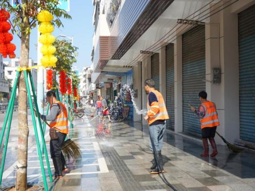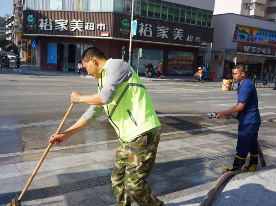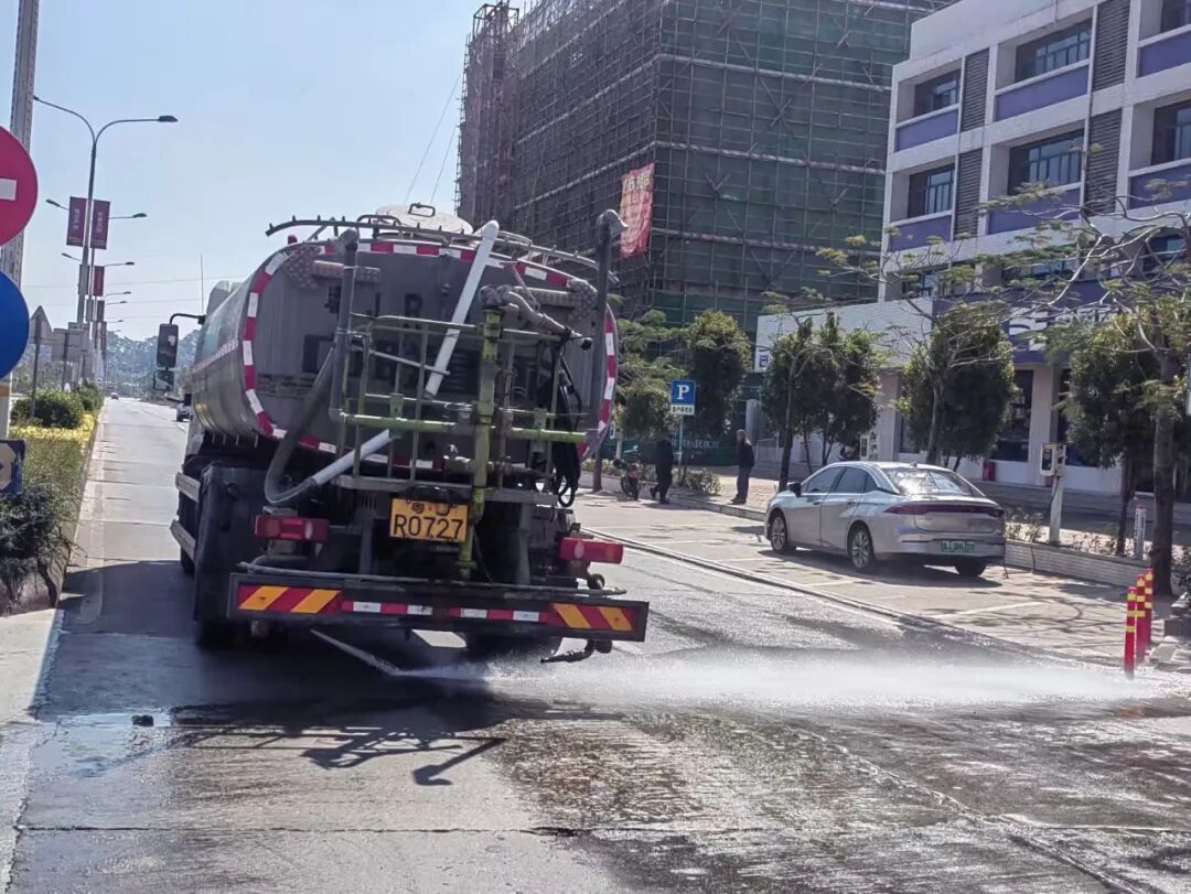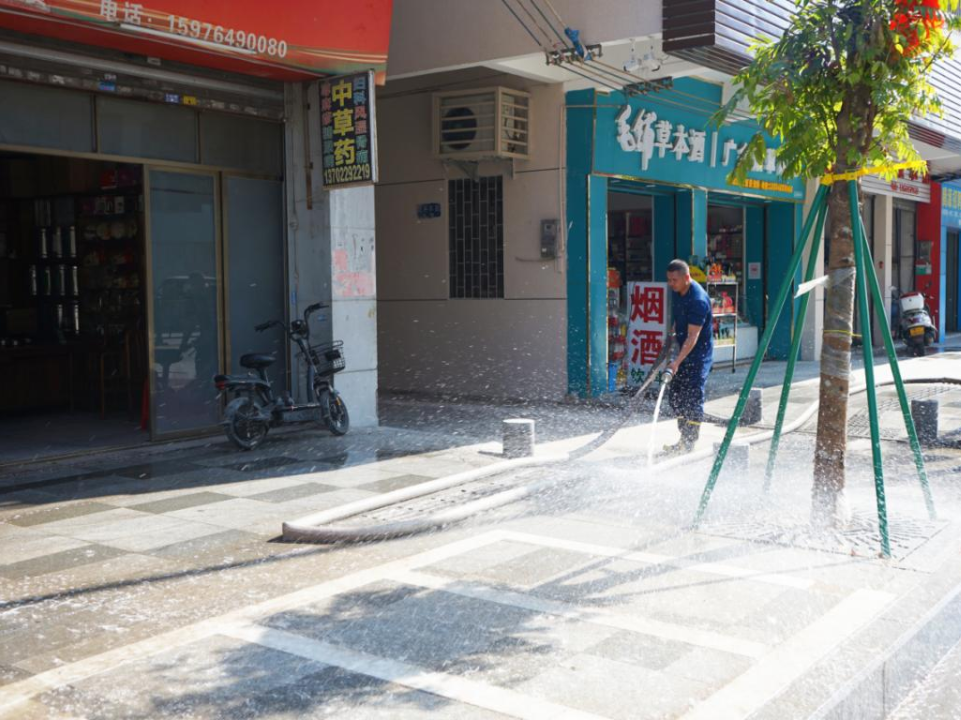 环卫公司出动专业力量,对主次干道开展洒水、机械化清扫作业,水花喷洒间,路面浮尘一扫而空,道路“见本色、显干净”;工作人员拿起高压水枪对准行人道路面顽固污渍进行冲洗,一冲一刷间,灰蒙蒙的地面恢复整洁,顽固污垢尽数清除。