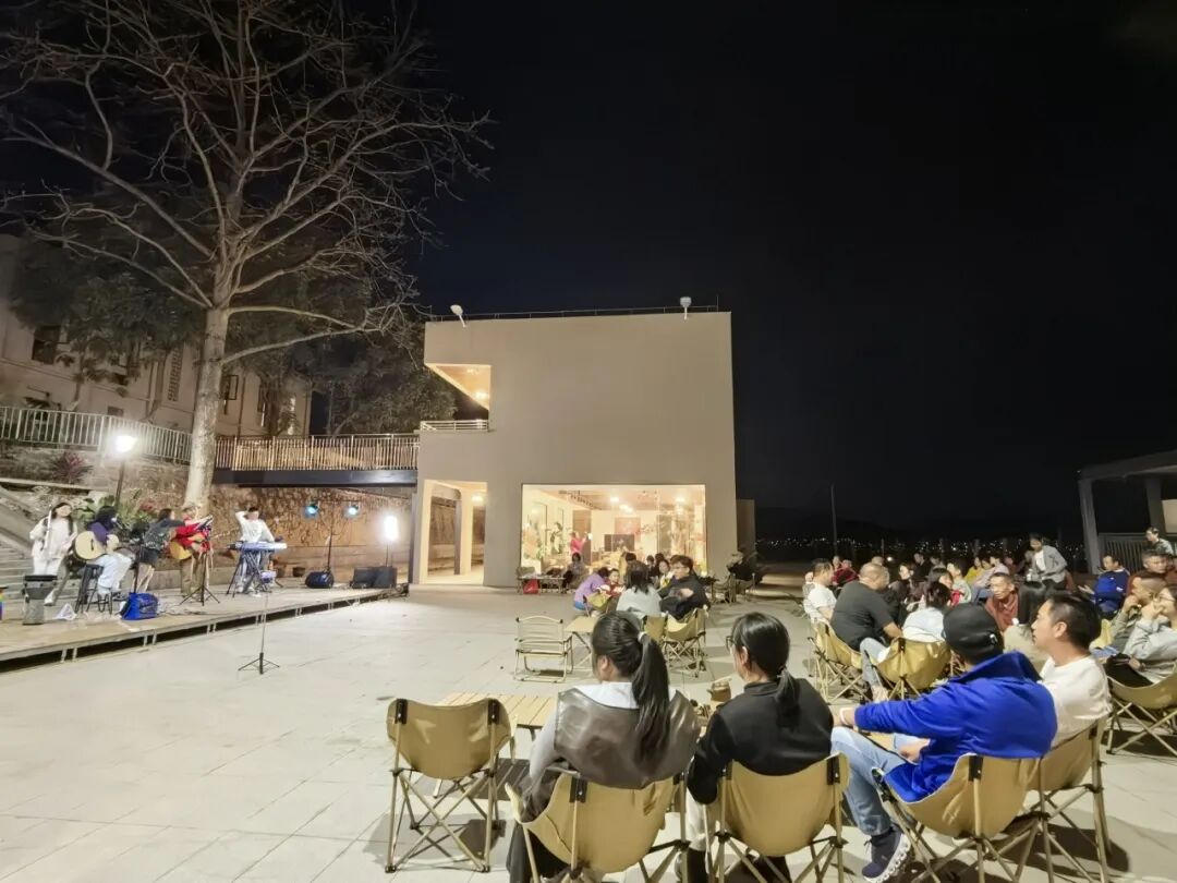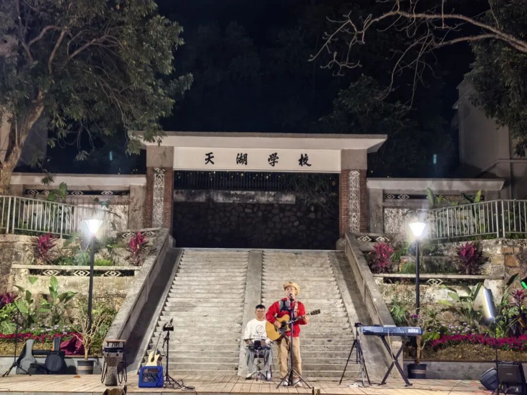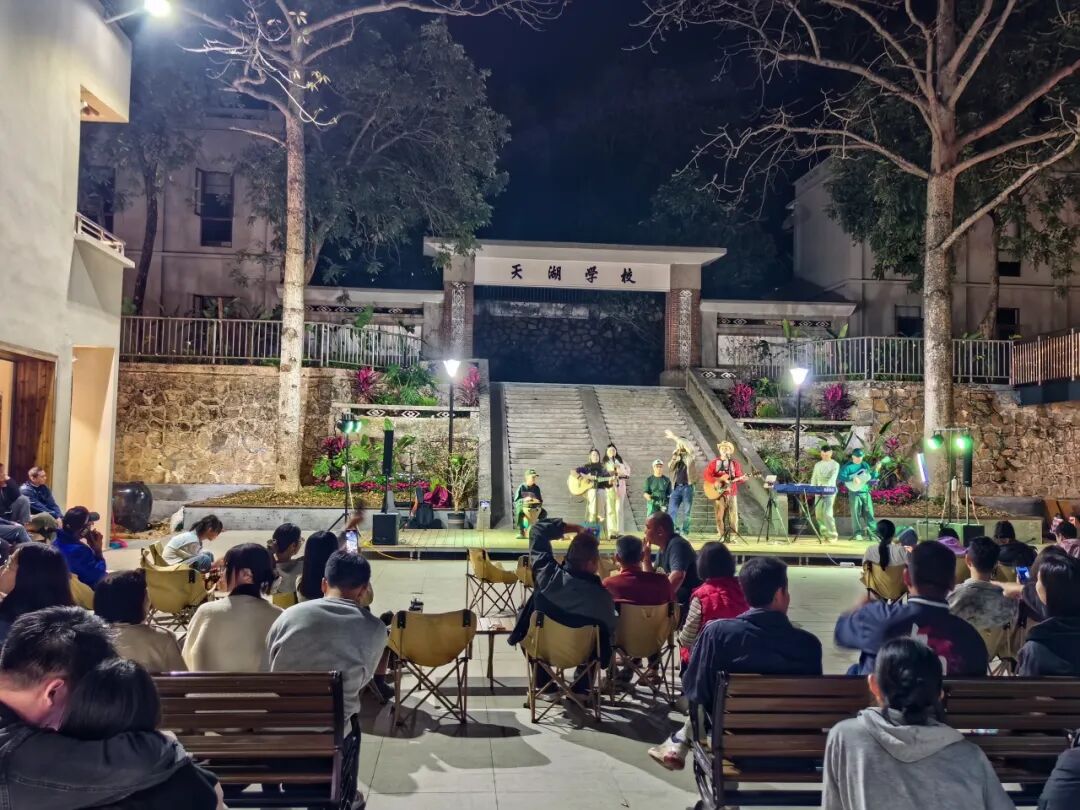 夜幕下的天湖庄园,百年天湖学校旧址前的露天舞台在灯光映衬下格外醒目。舞台上,民谣弹唱、乐队合奏等节目轮番上演,表演者们用充满岭南风情的旋律传递新春祝福;台下,观众或围坐于露营椅旁,或静坐在木质长椅上,伴着悠扬乐声与家人挚友闲话家常,沉浸式感受乡村夜晚的惬意与温暖。现场精心布置的休闲区人头攒动,大家共话团圆、共赏雅乐,处处洋溢着喜庆祥和的节日氛围。